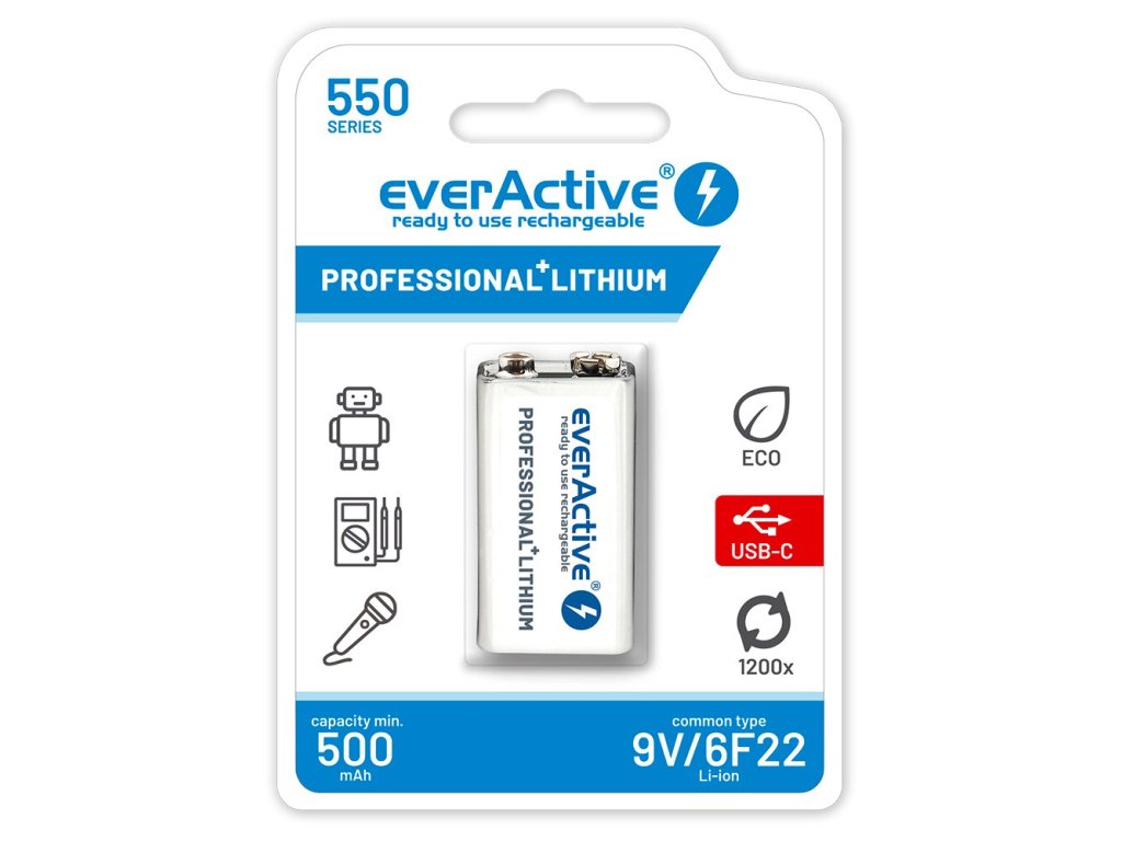Batéria everActive 9V / 6F22 Li-ion 550mAh s USB typ C konektorom, 1ks